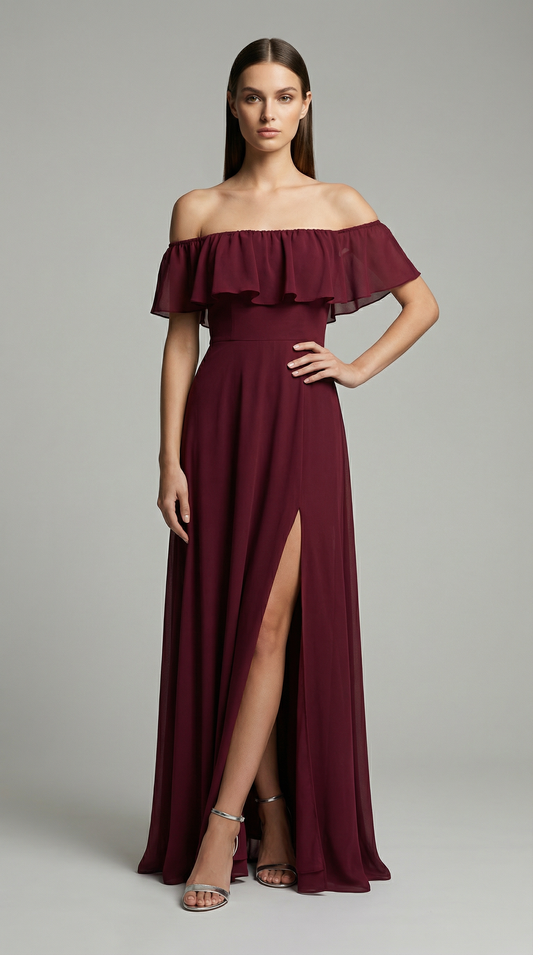 Elegant Off-The-Shoulder Maxi Bridesmaid Dress with High Slit