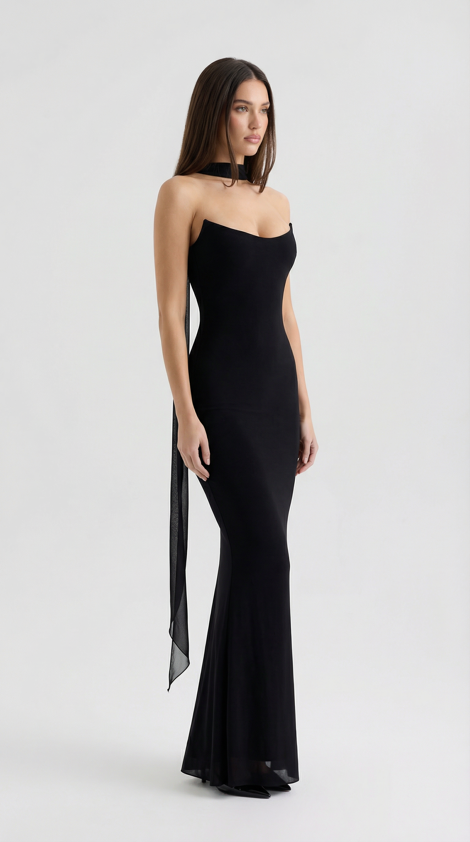 Wear it with pointed-toe heels and a mini clutch for a sharp, elevated look. Add minimal jewelry (small earrings or a bracelet) since the choker scarf is already a statement. For a more dramatic vibe, style with a sleek ponytail or wet-look hair and bold makeup.