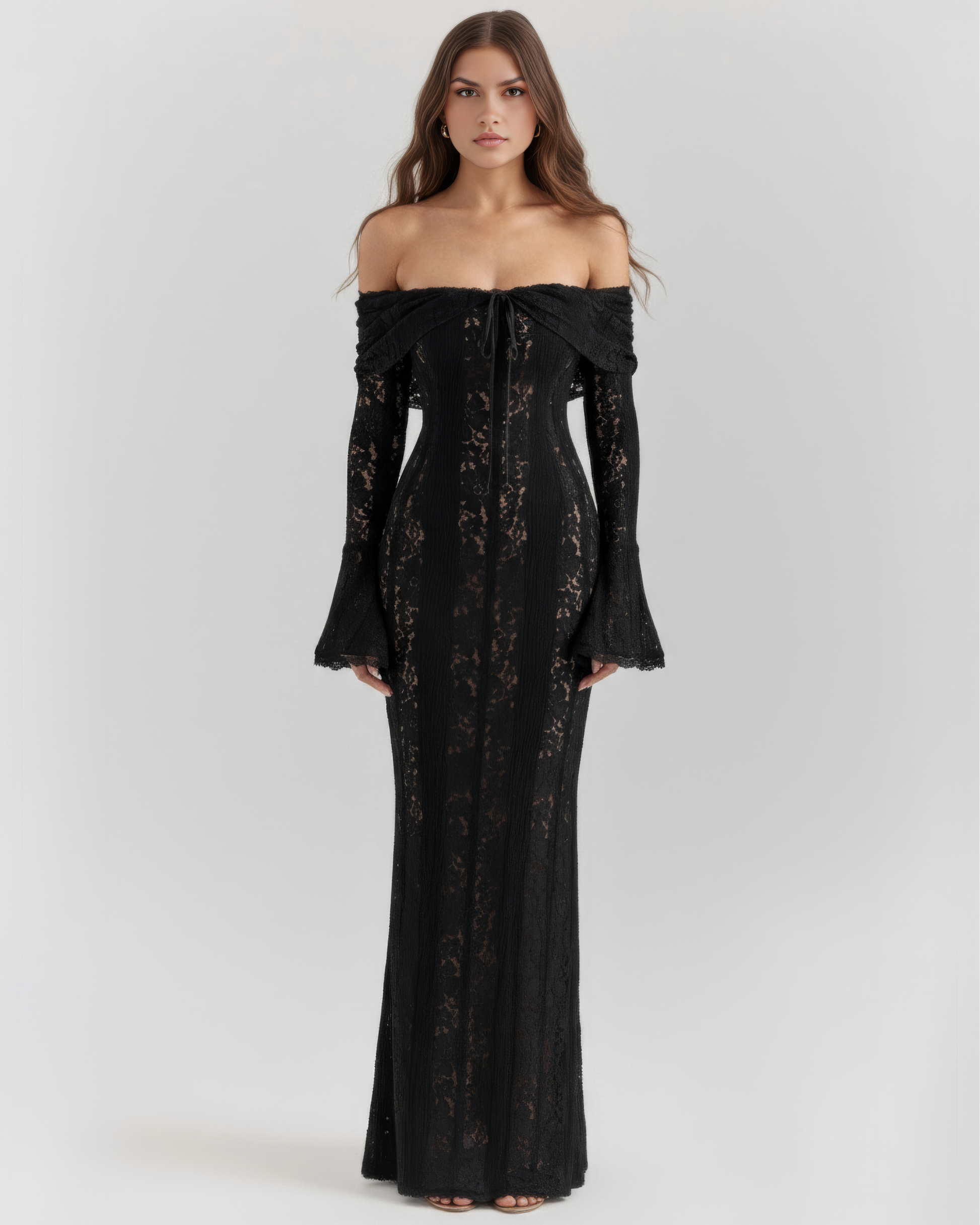The 'Alessandra' maxi dress in black is here to bring the drama. Stretch floral lace hugs your curves in all the right places, with contrast lining adding just the right pop underneath. The off-shoulder bodice is boned for support (and a little extra wow), while fluted cuffs serve up a touch of flair.