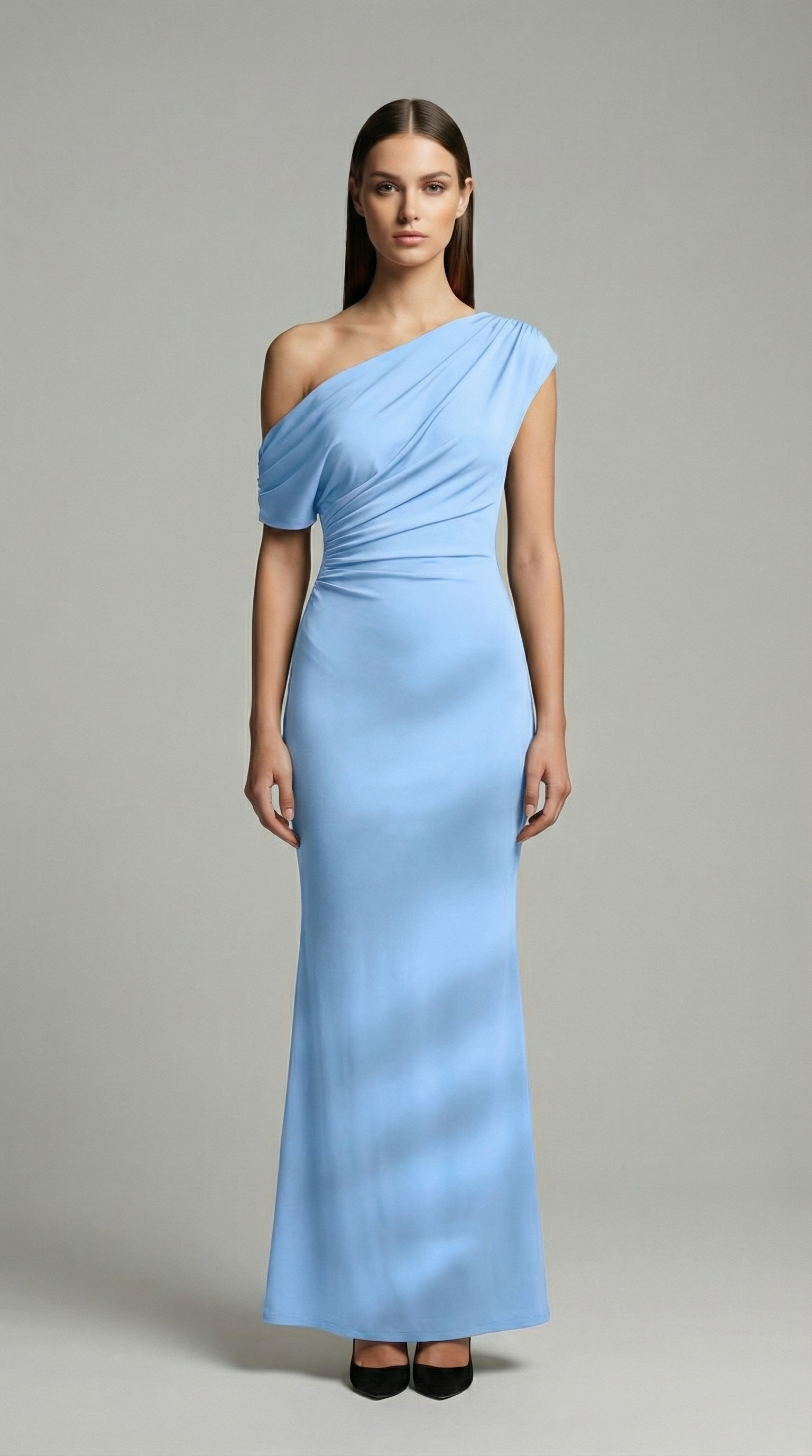 efined, timeless, and effortlessly elegant, this one-shoulder bodycon maxi dress is designed to elevate your evening wardrobe. Featuring a sleek asymmetrical neckline and softly draped detailing across the bodice, this dress highlights your natural curves while maintaining a polished, sophisticated silhouette.