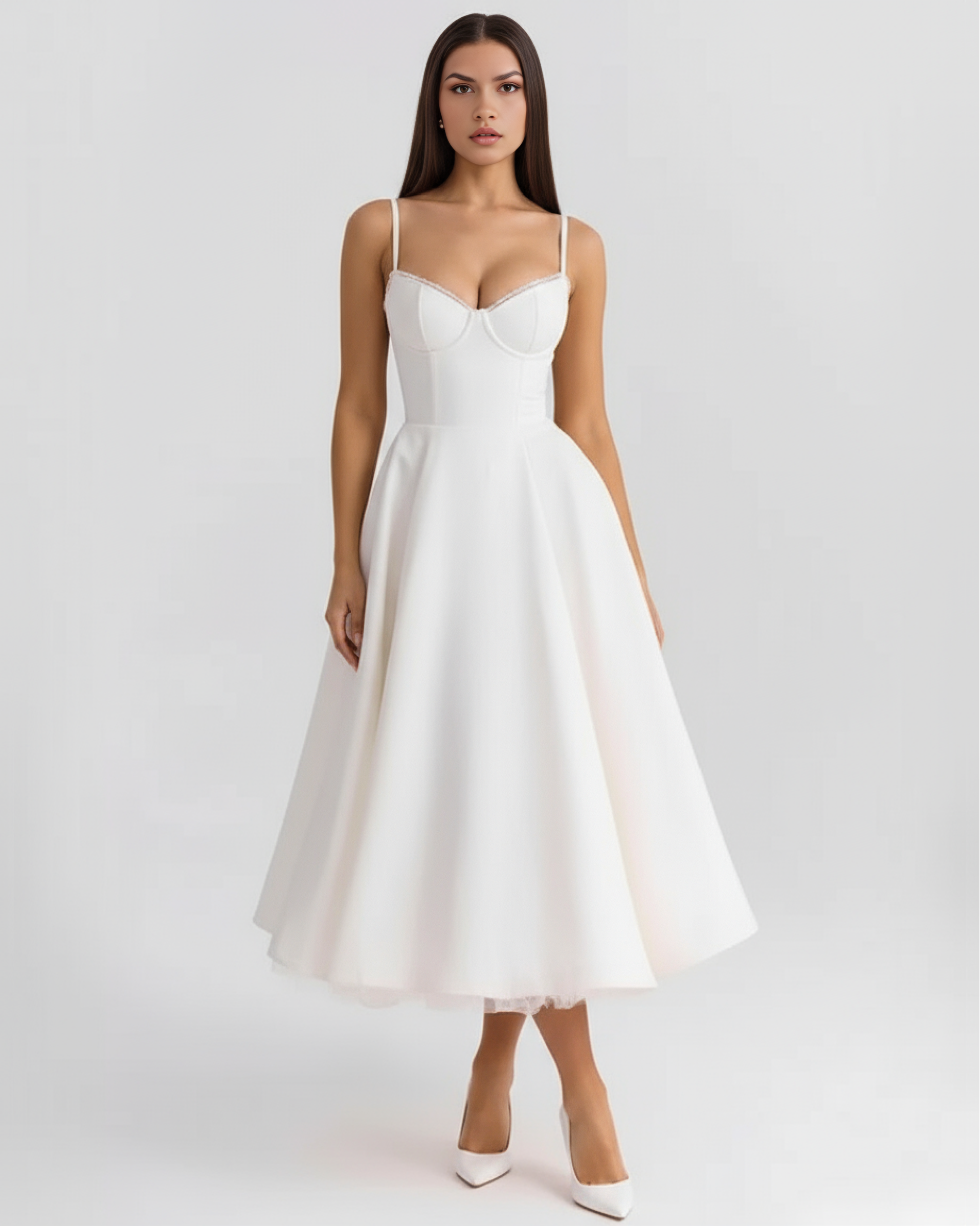Cut from lustrous fabric with a satin feel and hint of powermesh, our 'Selene' midi dress is what fairytales are made of. The bodice is perfectly boned to cinch your waist and has a pretty sweetheart neckline with underwired cups. The delicate straps adjust for the perfect fit and 'Selene' is all about the floaty midi skirt, fitted with a voluminous layer of the softest tulle for a stunning look that keeps the shape beautifully.